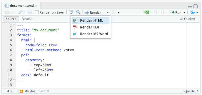 Note that the Render button also has a drop down menu that enables you to render to any of the formats listed in YAML front matter: