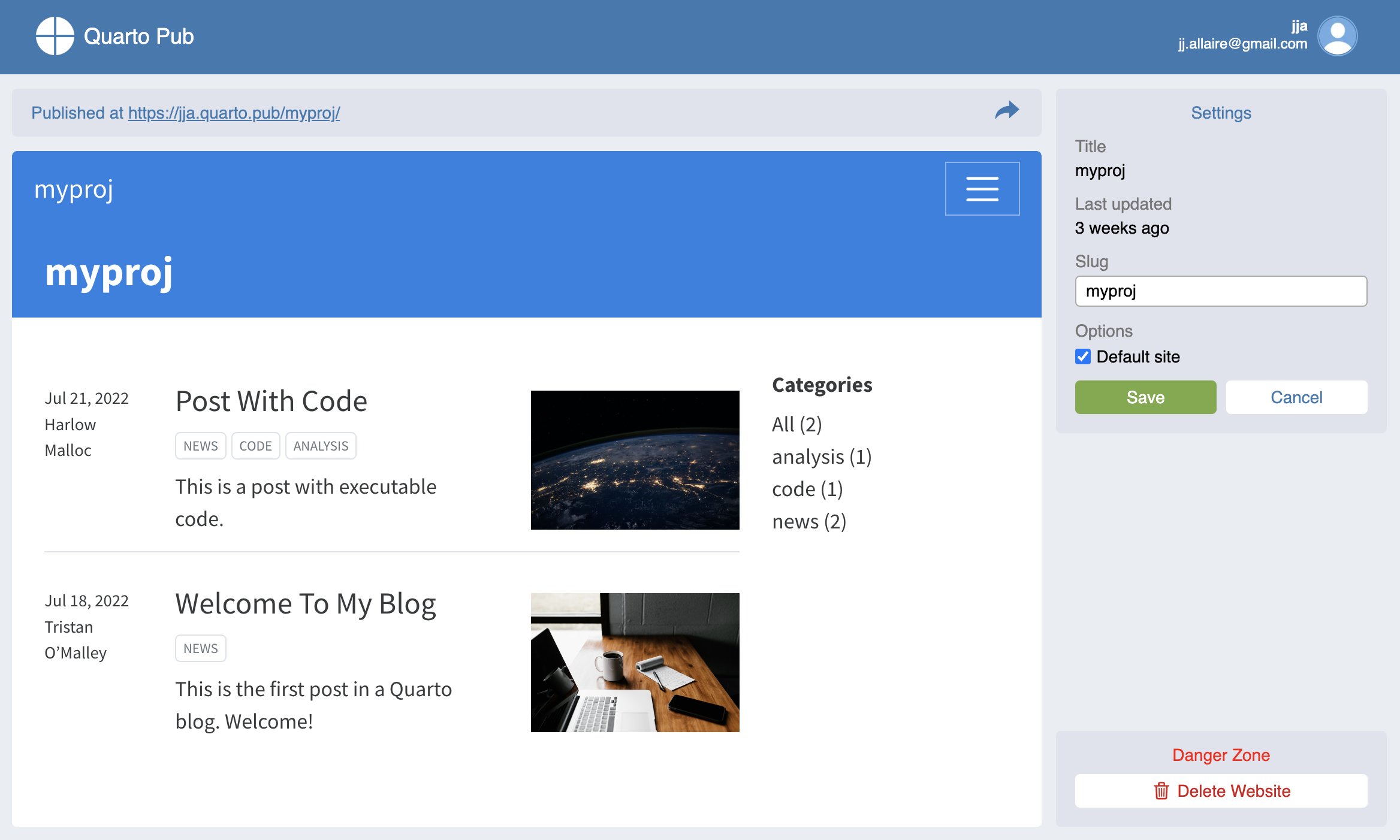 url: "https://njones.quarto.pub/blog"You can also manually create a _publish.yml file that looks like the example above, but with the appropriate id and url values for your site.
